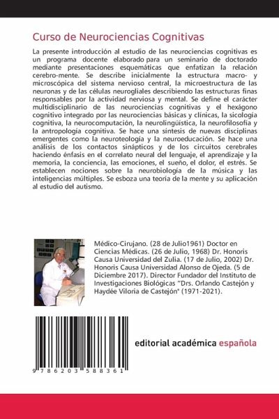La presente introducción al estudio de las neurociencias cognitivas es un programa docente elaborado para un seminario de doctorado mediante presentaciones esquemáticas que enfatizan la relación cerebro-mente. Se describe inicialmente la estructura macro- y microscópica del sistema nervioso central, la microestructura de las neuronas y de las células neurogliales describiendo las estructuras finas responsables por la actividad nerviosa y mental. Se define el carácter multidisciplinario de las neurociencias cognitivas y el hexágono cognitivo integrado por las neurociencias básicas y clínicas, la sicología cognitiva, la neurocomputación, la neurolingüística, la neurofilosofía y la antropología cognitiva. Se hace una síntesis de nuevas disciplinas emergentes como la neuroteología y la neuroeducación. Se hace una análisis de los contactos sinápticos y de los circuitos cerebrales haciendo énfasis en el correlato neural del lenguaje, el aprendizaje y la memoria, la conciencia, las emociones, el sueño, el dolor, el estrés. Se establecen nociones sobre la neurobiología de la música y las inteligencias múltiples. Se esboza una teoría de la mente y su aplicación al estudio del autismo.