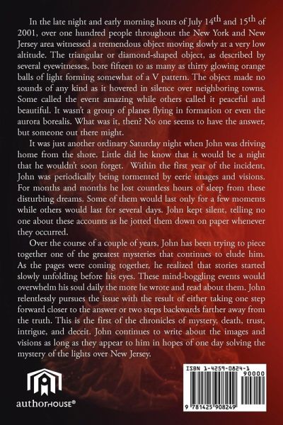 In the late night and early morning hours of July 14th and 15th of 2001, over one hundred people throughout the New York and New Jersey area witnessed a tremendous object moving slowly at a very low altitude. The triangular or diamond-shaped object, as described by several eyewitnesses, bore fifteen to as many as thirty glowing orange balls of light forming somewhat of a V pattern. The object made no sounds of any kind as it hovered in silence over neighboring towns. Some called the event amazing while others called it peaceful and beautiful. It wasn't a group of planes flying in formation or even the aurora borealis. What was it, then? No one seems to have the answer, but someone out there might. It was just another ordinary Saturday night when John was driving home from the shore. Little did he know that it would be a night that he wouldn't soon forget. Within the first year of the incident, John was periodically being tormented by eerie images and visions. For months and months he lost countless hours of sleep from these disturbing dreams. Some of them would last only for a few moments while others would last for several days. John kept silent, telling no one about these accounts as he jotted them down on paper whenever they occurred. Over the course of a couple of years, John has been trying to piece together one of the greatest mysteries that continues to elude him. As the pages were coming together, he realized that stories started slowly unfolding before his eyes. These mind-boggling events would overwhelm his soul daily the more he wrote and read about them. John relentlessly pursues the issue with the result of either taking one step forward closer to the answer or two steps backwards farther away from the truth. This is the first of the chronicles of mystery, death, trust, intrigue, and deceit. John continues to write about the images and visions as long as they appear to him in hopes of one day solving the mystery of the lights over New Jersey.