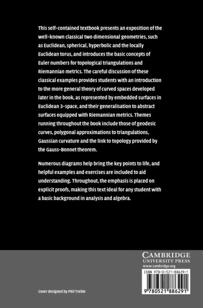 This self-contained 2007 textbook presents an exposition of the well-known classical two-dimensional geometries, such as Euclidean, spherical, hyperbolic, and the locally Euclidean torus, and introduces the basic concepts of Euler numbers for topological triangulations, and Riemannian metrics. The careful discussion of these classical examples provides students with an introduction to the more general theory of curved spaces developed later in the book, as represented by embedded surfaces in Euclidean 3-space, and their generalization to abstract surfaces equipped with Riemannian metrics. Themes running throughout include those of geodesic curves, polygonal approximations to triangulations, Gaussian curvature, and the link to topology provided by the Gauss-Bonnet theorem. Numerous diagrams help bring the key points to life and helpful examples and exercises are included to aid understanding. Throughout the emphasis is placed on explicit proofs, making this text ideal for any student with a basic background in analysis and algebra.