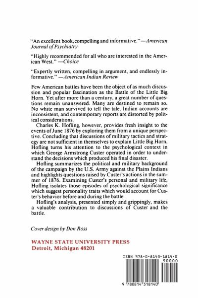 Few American battles have been the object of as much discussion and popular fascination as the Battle of the Little Big Horn. Yet after more than a century, a great number of questions remain unanswered. Many are destined to remain so. No white man survived to tell the tale, Indian accounts are inconsistent, and contemporary reports are distorted by political considerations. Charles K. Hofling, however, provides fresh insight to the events of June 1876 by exploring them from a unique perspective. Concluding that discussions of military tactics and strategy are not sufficient in themselves to explain Little Big Horn, Hofling turns his attention to the psychological context in which Custer operated in order to understand the decisions which produced his final disaster. Examining Custer's personal and military life, Hofling isolates those episodes of psychological significance which suggest personality traits which would account for Custer's behavior before and during the battle.