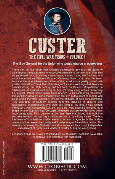 The 'Boy General' for the Union who would charge at everything There can be little doubt that Custer's catastrophic defeat at the Battle of Little Bighorn attracted more retrospective attention to the man than if he had simply retired from his military career having served during the Civil War and upon the American Western Frontier. Certainly, there have been far fewer books written about American soldiers of the period who arguably served with greater distinction. The author of this biography was a well regarded American novelist during the 19th century and his book on Custer's life-published in 1876-holds the distinction of being the first (of many ) biographies concerning his subject. Whilst some critics have referred to its content as 'adulatory', this verdict is possibly less accurate than that it is a document of its time and place and it therefore inevitably reflects the attitudes of both considerations. This biography indisputably benefits from the inclusion of opinions and recollections of participants who were still living at the time it was written. Whittaker's work-concerning Custer's entire life- was originally released as a single tome of approaching 700 pages of densely packed text delivered within large paragraphs. This Leonaur edition has therefore divided that work into two volumes each concerning a distinct portion of his military career. The text has been reformatted into smaller, easier to access paragraphs for the modern reader and has been enhanced by additional photographs and illustrations. This volume concerning the Civil War period is enhanced by a short independent assessment of Custer as a leader of cavalry during the war by Reid.