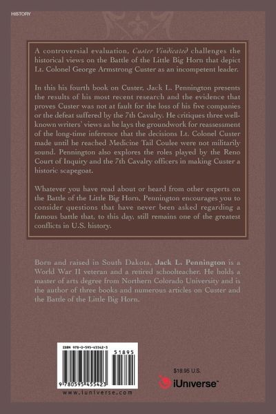 A controversial evaluation, Custer Vindicated challenges the historical views on the Battle of the Little Big Horn that depict Lt. Colonel George Armstrong Custer as an incompetent leader. In this his fourth book on Custer, Jack L. Pennington presents the results of his most recent research and the evidence that proves Custer was not at fault for the loss of his five companies or the defeat suffered by the 7th Cavalry. He critiques three well-known writers' views as he lays the groundwork for reassessment of the long-time inference that the decisions Lt. Colonel Custer made until he reached Medicine Tail Coulee were not militarily sound. Pennington also explores the roles played by the Reno Court of Inquiry and the 7th Cavalry officers in making Custer a historic scapegoat. Whatever you have read about or heard from other experts on the Battle of the Little Big Horn, Pennington encourages you to consider questions that have never been asked regarding a famous battle that, to this day, still remains one of the greatest conflicts in U.S. history.