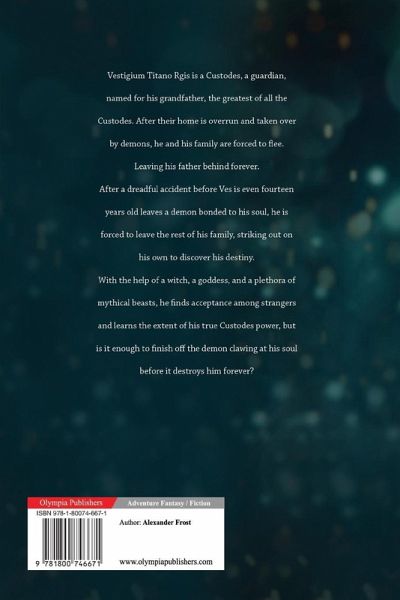 Vestigium Titano Rgis is a Custodes, a guardian, named for his grandfather, the greatest of all the Custodes. After their home is overrun and taken over by demons, he and his family are forced to flee. Leaving his father behind forever. After a dreadful accident before Ves is even fourteen years old leaves a demon bonded to his soul, he is forced to leave the rest of his family, striking out on his own to discover his destiny. With the help of a witch, a goddess, and a plethora of mythical beasts, he finds acceptance among strangers and learns the extent of his true Custodes power, but is it enough to finish off the demon clawing at his soul before it destroys him forever?