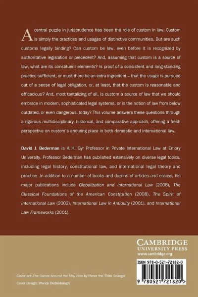 Part I. Customary Law in Perspective: 1. Anthropology: custom in pre-literate societies 2. Culture: the western legal tradition of positivism 3. History: the common law and custom 4. Economics, socio-biology and psychology: the human impulse of custom Part II. Custom in Domestic Legal Systems: 5. Family law 6. Property 7. Contracts 8. Torts 9. Constitutional law Part III. Custom in International Law: 10. Private international law: international commercial usage 11. Public international law: custom among nations Conclusion: how and why custom endures.