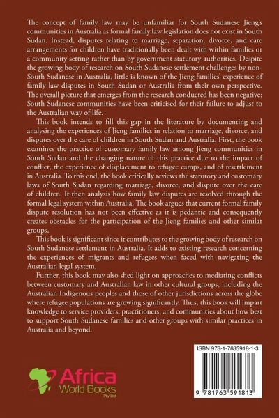 The concept of family law may be unfamiliar for South Sudanese Jieng's communities in Australia as formal family law legislation does not exist in South Sudan. Instead, disputes relating to marriage, separation, divorce, and care arrangements for children have traditionally been dealt with within families or a community setting rather than by government statutory authorities. Despite the growing body of research on South Sudanese settlement challenges by non-South Sudanese in Australia, little is known of the Jieng families' experience of family law disputes in South Sudan or Australia from their own perspective. The overall picture that emerges from the research conducted has been negative; South Sudanese communities have been criticised for their failure to adjust to the Australian way of life. This book intends to fill this gap in the literature by documenting and analysing the experiences of Jieng families in relation to marriage, divorce, and disputes over the care of children in South Sudan and Australia. First, the book examines the practice of customary family law among Jieng communities in South Sudan and the changing nature of this practice due to the impact of conflict, the experience of displacement to refugee camps, and of resettlement in Australia. To this end, the book critically reviews the statutory and customary laws of South Sudan regarding marriage, divorce, and dispute over the care of children. It then analysis how family law disputes are resolved through the formal legal system within Australia. The book argues that current formal family dispute resolution has not been effective as it is pedantic and consequently creates obstacles for the participation of the Jieng families and other similar groups. This book is significant since it contributes to the growing body of research on South Sudanese settlement in Australia. It adds to existing research concerning the experiences of migrants and refugees when faced with navigating the Australian legal system. Further, this book may also shed light on approaches to mediating conflicts between customary and Australian law in other cultural groups, including the Australian Indigenous peoples and those of other jurisdictions across the globe where refugee populations are growing significantly. Thus, this book will impart knowledge to service providers, practitioners, and communities about how best to support South Sudanese families and other groups with similar practices in Australia and beyond.