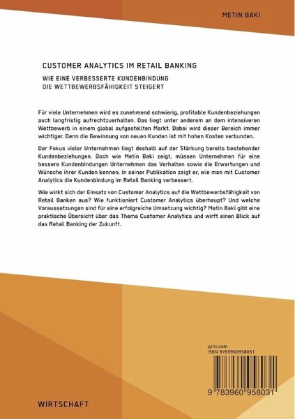 Für viele Unternehmen wird es zunehmend schwierig, profitable Kundenbeziehungen auch langfristig aufrechtzuerhalten. Das liegt unter anderem an dem intensiveren Wettbewerb in einem global aufgestellten Markt. Dabei wird dieser Bereich immer wichtiger. Denn die Gewinnung von neuen Kunden ist mit hohen Kosten verbunden.Der Fokus vieler Unternehmen liegt deshalb auf der Stärkung bereits bestehender Kundenbeziehungen. Doch wie Metin Baki zeigt, müssen Unternehmen für eine bessere Kundenbindungen Unternehmen das Verhalten sowie die Erwartungen und Wünsche ihrer Kunden kennen. In seiner Publikation zeigt er, wie man mit Customer Analytics die Kundenbindung im Retail Banking verbessert.Wie wirkt sich der Einsatz von Customer Analytics auf die Wettbewerbsfähigkeit von Retail Banken aus? Wie funktioniert Customer Analytics überhaupt? Und welche Voraussetzungen sind für eine erfolgreiche Umsetzung wichtig? Metin Baki gibt eine praktische Übersicht über das Thema Customer Analytics und wirft einen Blick auf das Retail Banking der Zukunft.Aus dem Inhalt:- Bankensektor;- Customer Relationship Management;- CRM;- Interaktion;- Personalisierung