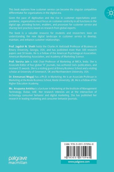 Chapter 1 - Customer-Centric Support Services: An Introduction to the next frontier for competitive advantage in the digital era.- Chapter 2 - Customer-Centric Support Services in the Digital Era.- Chapter 3 - Information as a Service for Consumer Decision Making.- Chapter 4 - The role of service design in enhancing marketing-customer service collaboration.- Chapter 5 - Digital strategies for aiding ease of decision-making in service.- Chapter 6 - Multichannel Consumer Service Integration of Recommendation Systems.- Chapter 7 - The Double-Edged Sword of Innovation for B2B Salespeople: A Conceptual Exploration of how B2B Salespeople fear Innovation.- Chapter 8 - Co-Creating Aftermarket Value in the Digital Era: Managing Transformative Customer Relationships Through Stakeholder Engagement.- Chapter 9 - Enhancing Upselling and Cross-selling in Business-to-Business Markets: The Critical Need to Integrate Customer Service and Sales Function.- Chapter 10 - Frontline Service Staff in the Digital Era: Managing a Human-Robotic Workforce.- Chapter 11 - . Navigating through the Digital Gates: Customer-centric Services and Wellbeing Business Environment.- Chapter 12 - Customer service opportunities & challenges in the post-pandemic world.