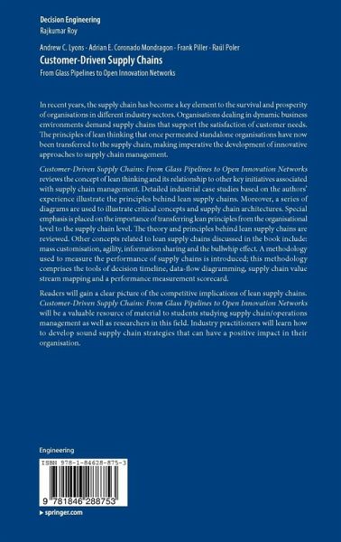 Customer-driven Supply Chains: Strategies for Lean and Agile Supply Chain Design reviews the concept of lean thinking and its relationship to other key initiatives associated with supply chain management. Detailed industrial case studies based on the authors' experience illustrate the principles behind lean supply chains. Moreover, a series of diagrams are used to illustrate critical concepts and supply chain architectures. Special emphasis is placed on the importance of transferring lean principles from the organisational level to the supply chain level. The theory and principles behind lean supply chains are reviewed. Other concepts related to lean supply chains discussed in the book include: mass customisation, agility, information sharing and the bullwhip effect. A methodology used to measure the performance of supply chains is introduced; this methodology comprises the tools of decision timeline, data-flow diagramming, supply chain value stream mapping and a performance measurement scorecard.