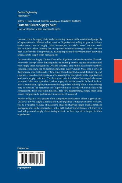 Customer-driven Supply Chains: Strategies for Lean and Agile Supply Chain Design reviews the concept of lean thinking and its relationship to other key initiatives associated with supply chain management. Detailed industrial case studies based on the authors' experience illustrate the principles behind lean supply chains. Moreover, a series of diagrams are used to illustrate critical concepts and supply chain architectures. Special emphasis is placed on the importance of transferring lean principles from the organisational level to the supply chain level. The theory and principles behind lean supply chains are reviewed. Other concepts related to lean supply chains discussed in the book include: mass customisation, agility, information sharing and the bullwhip effect. A methodology used to measure the performance of supply chains is introduced; this methodology comprises the tools of decision timeline, data-flow diagramming, supply chain value stream mapping and a performance measurement scorecard.
