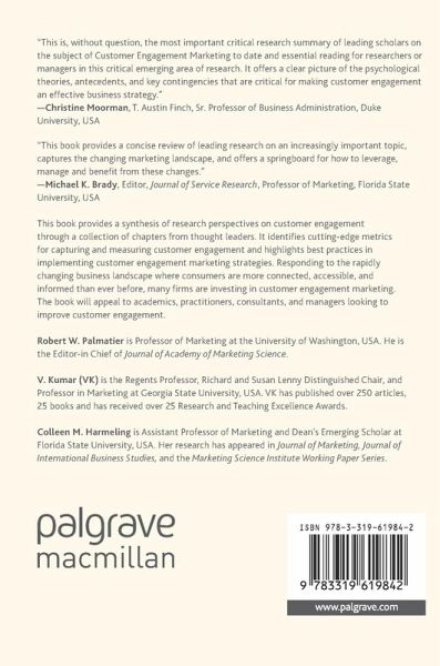 This book provides a synthesis of research perspectives on customer engagement through a collection of chapters from thought leaders. It identifies cutting-edge metrics for capturing and measuring customer engagement and highlights best practices in implementing customer engagement marketing strategies. Responding to the rapidly changing business landscape where consumers are more connected, accessible, and informed than ever before, many firms are investing in customer engagement marketing. The book will appeal to academics, practitioners, consultants, and managers looking to improve customer engagement.