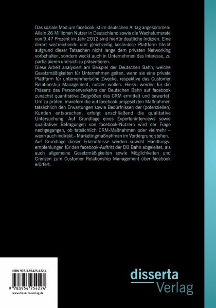 Diese Arbeit analysiert am Beispiel der Deutschen Bahn, welche Gesetzmäßigkeiten für Unternehmen gelten, wenn sie eine private Plattform für unternehmerische Zwecke, respektive das Customer Relationship Management, nutzen wollen. Hierzu werden für die Präsenz des Personenverkehrs der Deutschen Bahn auf facebook zunächst quantitative Zielgrößen des CRM ermittelt und bewertet. Um zu prüfen, inwiefern die auf facebook umgesetzten Maßnahmen tatsächlich den Erwartungen sowie Bedürfnissen der (potenziellen) Kunden entsprechen, erfolgt anschließend die qualitative Untersuchung. Auf Grundlage eines Experteninterviews sowie qualitativer Befragungen von facebook-Nutzern wird der Frage nachgegangen, ob tatsächlich CRM-Maßnahmen oder vielmehr wenn auch indirekt Marketingmaßnahmen im Vordergrund stehen.