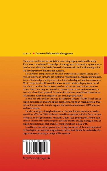 Companies and financial institutions are employing operational information systems in an efficient way. While they have consolidated a strong level of knowledge in management information systems, there is still a lack of knowledge on the right way to apply customer relationship management (CRM) systems under a business perspective. Most of the companies are still having problems in evaluating how CRM can meet with the expected results. The level of complexity is perceived both under a technological and organizational point of view. A complete innovation process and heavy change management initiatives should be ensured in order to have effective and successful systems. This book offers a solid theoretical and practical perspective on how to face CRM projects, describing the most appropriate technologies and organizational issues that have to be considered. Some explaining cases have been included as well.