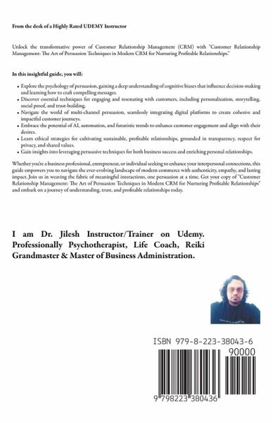 From the desk of a Highly Rated UDEMY Instructor Unlock the transformative power of Customer Relationship Management (CRM) with "Customer Relationship Management: The Art of Persuasion Techniques in Modern CRM for Nurturing Profitable Relationships." In this insightful guide, you will:Explore the psychology of persuasion, gaining a deep understanding of cognitive biases that influence decision-making and learning how to craft compelling messages. Discover essential techniques for engaging and resonating with customers, including personalization, storytelling, social proof, and trust-building. Navigate the world of multi-channel persuasion, seamlessly integrating digital platforms to create cohesive and impactful customer journeys. Embrace the potential of AI, automation, and futuristic trends to enhance customer engagement and align with their desires. Learn ethical strategies for cultivating sustainable, profitable relationships, grounded in transparency, respect for privacy, and shared values. Gain insights into leveraging persuasive techniques for both business success and enriching personal relationships. Whether you're a business professional, entrepreneur, or individual seeking to enhance your interpersonal connections, this guide empowers you to navigate the ever-evolving landscape of modern commerce with authenticity, empathy, and lasting impact. Join us in weaving the fabric of meaningful interactions, one persuasion at a time. Get your copy of "Customer Relationship Management: The Art of Persuasion Techniques in Modern CRM for Nurturing Profitable Relationships" and embark on a journey of understanding, trust, and profitable relationships today.