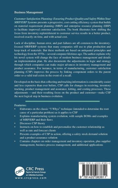 Focus on Customer Satisfaction for Increased Profit Statistics show that a single satisfied customer can bring a company two new ones but one unsatisfied client can cost it four. With this principle in mind, Customer Satisfaction Planning: Ensuring Product Quality and Safety within Your MRP/ERP Systems presents a progressive, cost-cutting efficiency system that builds on material requirement planning (MRP) and enterprise resource planning (ERP) to facilitate improved customer satisfaction. The book illustrates how shifting the focus from inventory replenishment to customer service results in a better product, received exactly on time, and with actual cost. Such a change is bound to make the company grow, benefiting its employees and suppliers, as well as the surrounding community. Overhaul an Outmoded System Lack of discipline, human error, and part failures are all common to the inventory-focused MRP/ERP systems that many companies still use to plan production and keep track of materials. But these methods are based on antiquated principles and technology from the 1970s-several computer lifetimes ago. The author explains why his novel system will change the face of modern business management and details an implementation plan. He also documents the adjustments in logic and strategy through which companies can make major advances in inventory management and product assurance. For instance, in terms of manufacturing, customer satisfaction planning (CSP) improves the process by linking component orders to the parent order so a valid trail exists in the event of a recall. Developed on the basis that collecting and tracking information is considerably easier and less expensive than ever before, CSP calls for changes in receiving, inventory tracking, product management and assurance, kitting, and costing processes. These adjustments -and their resulting focus on the product and customer-make CSP the next logical step in business evolution.
