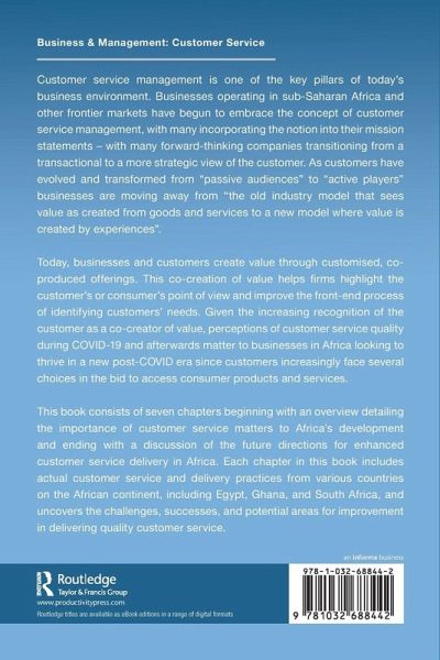 This book consists of seven chapters beginning with an overview detailing the importance of customer service matters to Africaâ s development and ending with a discussion of the future directions for enhanced customer service delivery in Africa.