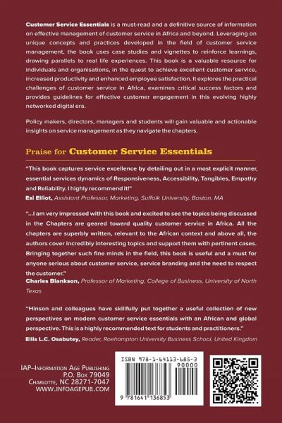 Customer Service Essentials is a must-read and a definitive source of information on effective management of customer service in Africa and beyond. Leveraging on unique concepts and practices developed in the field of customer service management, this book uses case studies and vignettes to reinforce learnings, drawing parallels to real life experiences. The book is a valuable resource for individuals and organizations, in the quest to achieve excellent customer service, increased productivity and enhanced employee satisfaction. It explores the practical challenges of customer service in Africa, examines critical success factors and provides guidelines for effective customer engagement in this evolving highly networked digital era. Policy makers, directors, managers and students will gain valuable and actionable insights on service management as they navigate the chapters.