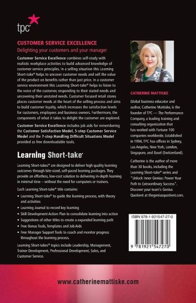 Customer Service Excellence is a mini-training program in a book designed for customer service professionals, customer service representatives, sales people and business professionals.Customer Service Excellence combines self-study with realistic workplace activities to build advanced knowledge of customer service principles.In a selling situation this Learning Short-take helps to uncover customer needs and sell the value of the produce on benefits rather than just price. In a customer service environment this Learning Short-take helps to listen to the voice of the customer, responding to their stated needs and uncovering their unstated needs.The book includes free downloadable job aids and tools.