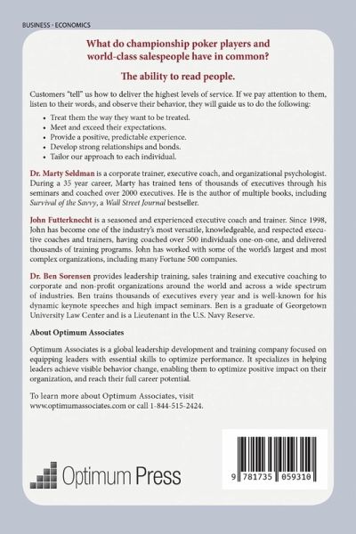 What do championship poker players and world-class salespeople have in common? The ability to read people. Customers "tell" us how to deliver the highest levels of service. If we pay attention to them, listen to their words, and observe their behavior, they will guide us to do the following: ¿ Treat them the way they want to be treated. ¿ Meet and exceed their expectations. ¿ Provide a positive, predictable experience. ¿ Develop strong relationships and bonds. ¿ Tailor our approach to each individual.