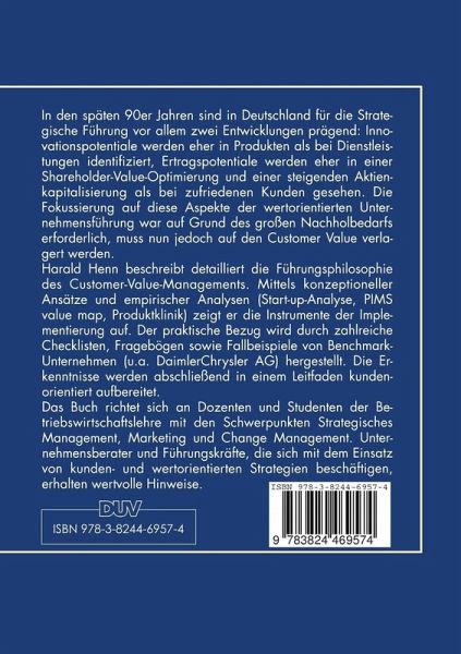 In den späten 90er Jahren sind in Deutschland für die Strategische Führung vor allem zwei Entwicklungen prägend: Innovationspotentiale werden eher in Produkten als bei Dienstleistungen identifiziert, Ertragspotentiale werden eher in einer Shareholder-Value-Optimierung und einer steigenden Aktienkapitalisierung als bei zufriedenen Kunden gesehen. Die Fokussierung auf diese Aspekte der wertorientierten Unternehmensführung war auf Grund des großen Nachholbedarfs erforderlich, muss nun jedoch auf den Customer Value verlagert werden. Harald Henn beschreibt detailliert die Führungsphilosophie des Customer-Value-Managements. Mittels konzeptioneller Ansätze und empirischer Analysen (Start-up-Analyse, PIMS value map, Produktklinik) zeigt er die Instrumente der Implementierung auf. Der praktische Bezug wird durch zahlreiche Checklisten, Fragebögen sowie Fallbeispiele von Benchmark-Unternehmen (u. a. DaimlerChrysler AG) hergestellt. Die Erkenntnisse werden abschließend in einem Leitfaden kundenorientiert aufbereitet.