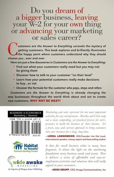 The goal of "Customers are the Answer to Everything" is to show each individual business how they can find customers suited for them and---even better---how their ideal customers can find them. The book content is unique and appealing, and easy for any business to execute. The premise is based on the authors’ experience of working with over 2300 clients just like you. We have uncovered 9 leverages that will catapult any business into action. These leverages focus on getting customers through the door. You’ll identify the key leverages for your business. And you will be pleasantly pleased that…mehr