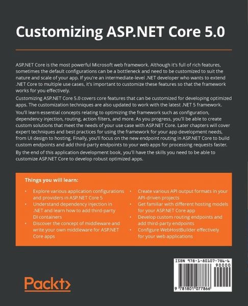 A guide to discovering the hidden behaviors of ASP.NET Core that can be customized to optimize your .NET 5 applications Key Features:Customize the default behavior of ASP.NET Core to get the most out of the framework Enhance the app configuration, change the default dependency injection, and build your own tag helpers Discover best practices for configuring ASP.NET Core, from user interface design to hosting it on platforms Book description: ASP.NET Core is the most powerful Microsoft web framework. Although it's full of rich features, sometimes the default configurations can be a bottleneck and need to be customized to suit the nature and scale of your app. If you're an intermediate-level .NET developer who wants to extend .NET Core to multiple use cases, it's important to customize these features so that the framework works for you effectively. Customizing ASP.NET Core 5.0 covers core features that can be customized for developing optimized apps. The customization techniques are also updated to work with the latest .NET 5 framework. You'll learn essential concepts relating to optimizing the framework such as configuration, dependency injection, routing, action filters, and more. As you progress, you'll be able to create custom solutions that meet the needs of your use case with ASP.NET Core. Later chapters will cover expert techniques and best practices for using the framework for your app development needs, from UI design to hosting. Finally, you'll focus on the new endpoint routing in ASP.NET Core to build custom endpoints and add third-party endpoints to your web apps for processing requests faster. By the end of this application development book, you'll have the skills you need to be able to customize ASP.NET Core to develop robust optimized apps. What You Will Learn:Explore various application configurations and providers in ASP.NET Core 5 Understand dependency injection in .NET and learn how to add third-party DI containers Discover the concept of middleware and write your own middleware for ASP.NET Core apps Create various API output formats in your API-driven projects Get familiar with different hosting models for your ASP.NET Core app Develop custom routing endpoints and add third-party endpoints Configure WebHostBuilder effectively for your web applications Who this book is for: ¿This .NET 5 book is for .NET developers who need to change the default behaviors of the framework to help improve the performance of their applications. Intermediate-level knowledge of ASP.NET Core and C# is required before getting started with the book.