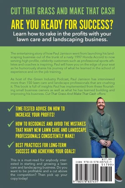 Are you ready for success? Learn how to rake in the profits with your lawn care and landscaping business. The entertaining story of how Paul Jamison went from launching his landscaping business out of the trunk of a rusty 1997 Honda Accord to now serving high profile, celebrity customers such as professional sports athletes and coaches is inspiring. Paul will have you on the edge of your seat as he humorously shares his journey of what he learned in the school of experience and on the job training. As host of the Green Industry Podcast, Paul Jamison has interviewed more than 150 lawn care and landscape professionals that are crushing it. This book is full of insights Paul has implemented from these flourishing small business owners as well as what he has learned building and improving his business. Cut That Grass And Make That Cash offers: Time-tested advice on how to increase your profits! How to recognize and avoid the mistakes that many new lawn care and landscape professionals consistently make! Best practices for long-term success and achieving your goals! This is a must-read for anybody interested in starting and growing a lawn care and landscaping business. Do you want to be profitable and a cut above the competition? Then pick up your copy today!