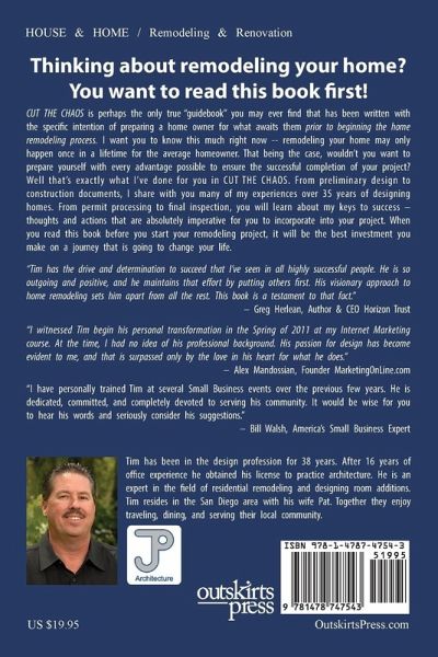 CUT THE CHAOS is perhaps the only true "guidebook" you may ever find that has been written with the specific intention of preparing a home owner for what awaits them prior to beginning the home remodeling process. I want you to know this much right now -- remodeling your home may only happen once in a lifetime for the average homeowner. That being the case, wouldn't you want to prepare yourself with every advantage possible to ensure the successful completion of your project? Well that's exactly what I've done for you in CUT THE CHAOS. From preliminary design to construction documents, I share with you many of my experiences over 35 years of designing homes. From permit processing to final inspection, you will learn about my keys to success - thoughts and actions that are absolutely imperative for you to incorporate into your project. When you read this book before you start your remodeling project, it will be the best investment you make on a journey that is going to change your life. "Tim has the drive and determination to succeed that I've seen in all highly successful people. He is so outgoing and positive, and he maintains that effort by putting others first. His visionary approach to home remodeling sets him apart from all the rest. This book is a testament to that fact." - Greg Herlean, Author & CEO Horizon Trust. "I witnessed Tim begin his personal transformation in the Spring of 2011 at my Internet Marketing course. At the time, I had no idea of his professional background. His passion for design has become evident to me, and that is surpassed only by the love in his heart for what he does." - Alex Mandossian, Founder MarketingOnLine.com. "I have personally trained Tim at several Small Business events over the previous few years. He is dedicated, committed, and completely devoted to serving his community. It would be wise for you to hear his words and seriously consider his suggestions." - Bill Walsh, America's Small Busines