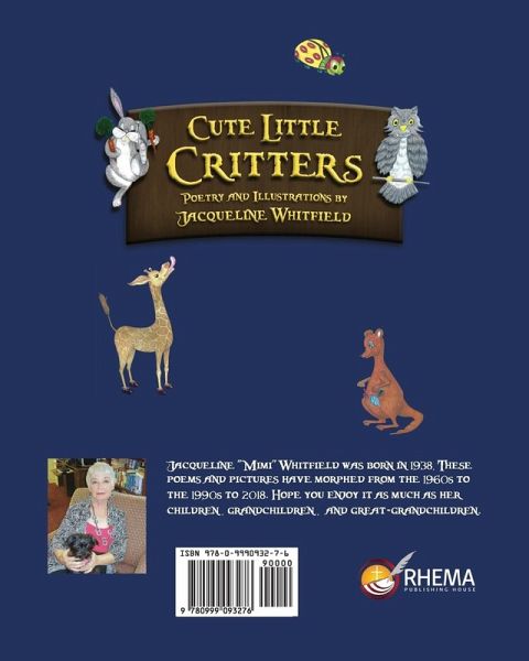 Cute Little Critters was written and illustrated by Jacqueline "Mimi" Whitfield for her grandchildren. She first wrote these poems on a manual typewriter and drew the pictures on typing paper in the 1960s for her three grandchildren. They have since morphed through the years for her children, grandchildren, and great-grandchidlren-and now she is happy to share them with others.