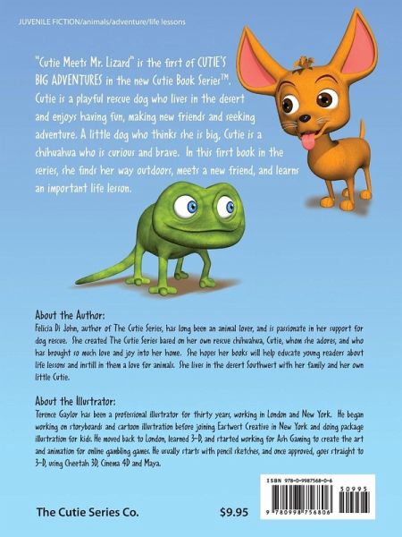Cutie's Big Adventures, Cutie Meets Mr. lizard is a Cutie Book Series for children, written by Felicia Di John and illustrated by Terence Gaylor. We meet the adorable rescue dog Cutie, a sweet, curious, adventurous chihuahua who lives in a house in the desert. She is a little dog who thinks she is big. Cutie is never happy when her mom leaves her for school because that means she will be home all alone. So today, Cutie decides to go outdoors by herself to play. She explores the desert around her, makes a new friend, and finds that some animals eat strange things. She is having so much fun that she almost forgets to get back home before her mom arrives.