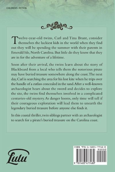 Twelve-year-old twins, Carl and Tina Brant, consider themselves the luckiest kids in the world when they find out they will be spending the summer with their parents in Emerald Isle, North Carolina. But little do they know that they are in for the adventure of a lifetime. Soon after their arrival, the twins learn about the story of Blackbeard from a local who tells them the notorious pirate may have buried treasure somewhere along the coast. The next day, Carl is searching the area for his lost kite when he trips over the handle of a cutlass concealed in the sand. After a well-known archaeologist hears about the sword and decides to explore the site, the twins find themselves involved in a complicated centuries-old mystery. As danger looms, only time will tell if their courageous exploration will lead them to unearth the legendary buried treasure before anyone else finds it. In this coastal thriller, twin siblings partner with an archaeologist to search for a pirate's buried treasure on the Carolina coast.