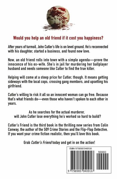 Would you help an old friend if it cost you happiness? After years of turmoil, John Cutler's life is on level ground. He's reconnected with his daughter, started a business, and found new love. Now, an old friend rolls into town with a simple agenda-prove the innocence of his ex-wife. She's in jail for murdering her husband and needs someone like Cutler to find the true killer. Helping will come at a steep price for Cutler. It means getting sideways with the local cops, crossing gang members, and upsetting his girlfriend. Cutler's willing to risk it all so an innocent woman can go free. Because that's what friends do-even those who haven't spoken to each other in years. As he searches for the actual murderer, will John Cutler lose everything he's worked so hard to build? Cutler's Friend is the third book in the thrilling new series from Colin Conway, the author of the 509 Crime Stories and the Flip-Flop Detective. If you want your crime fiction realistic, then you'll love this book. Grab Cutler's Friend today and get in on the action!