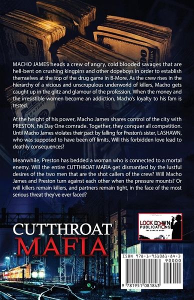 MACHO JAMES heads a crew of angry, cold blooded savages that are hell-bent on crushing kingpins and other dopeboys in order to establish themselves at the top of the drug game in B-More. As the crew rises in the hierarchy of a vicious and unscrupulous underworld of killers, Macho gets caught up in the glitz and glamour of the profession. When the money and the irresistible women become an addiction, Macho's loyalty to his fam is tested. At the height of his power, Macho James shares control of the city with PRESTON, his Day One comrade. Together, they conquer all competition. Until Macho James violates their pact by falling for Preston's sister, LASHAWN, who was supposed to have been off limits. Will this forbidden love lead to deathly consequences? Meanwhile, Preston has bedded a woman who is connected to a mortal enemy. Will the entire CUTTHROAT MAFIA get dismantled by the lustful desires of the two men that are the shot callers of the crew? Will Macho James and Preston turn against each other when the pressure mounts? Or will killers remain killers, and partners remain tight, in the face of the most serious threat they've ever faced?