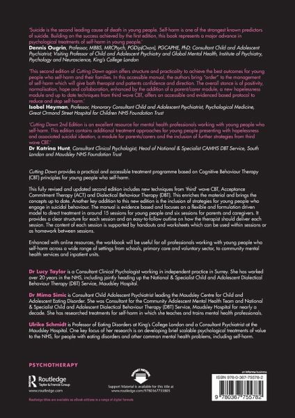 'Cutting Down 2nd Edition is an excellent resource for mental health professionals working with young people who self-harm. This edition contains additional treatment approaches for young people presenting with hopelessness and associated suicidal ideation, a module for parents/carers and the inclusion of further strategies from third wave CBT.' Dr Katrina Hunt, Consultant Clinical Psychologist, Head of National & Specialist CAMHS DBT Service, South London and Maudsley NHS Foundation Trust