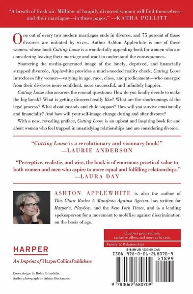 For women contemplating divorce or for those who have already divorced, Ashton Applewhites insightful book sheds light on what to consider before making the decision to end your marriage, how to protect yourselfboth financially and emotionallyand how much your life will change. One out of every two modern marriages ends in divorce, and 75 percent of those divorces are initiated by wives. Author Ashton Applewhite is one of these women, having sued for divorce after enduring an unfulfilling ten-year marriage. Cutting Loose is an essential resource for women who want to leave their marriage but fear the consequences. Shattering the media-generated image of the lonely, deprived and financially strapped divorcee, Applewhite provides a much needed reality check. Cutting Loose introduces 50 women, varying in age, race, class and predicament, who have thrived after initiating their own divorces. Their fears of financial, emotional and romantic ruin were never realized; on the contrary, their lives improved immeasurably, and their self-esteem soared. Cutting Loose also answers the crucial questions: How do you finally decide to make the big break? What is getting divorced really like? What are the shortcomings of the legal process? What about custody and child support? Financial and emotional survival? And how does a woman's self-image change during and after divorce? "Ending any kind of oppression takes belief in self. Cutting Loose offers moving evidence of how such belief works, whether in a relationship or walking the road alone. Perceptive, realistic, and wise, the book is of enormous practical value to both women and men who aspire to more equal and fulfilling relationships."Laura Day, author of Practical Intuition
