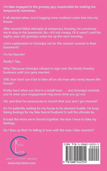 I'm fake engaged to the grumpy guy responsible for making me temporarily homeless. It all started when JoJo's logging crew crashed a pine tree into my house. After several failed attempts at temporary housing, he convinces me to stay in his basement. No-it's not creepy. Or it wasn't until his eighty-year-old grandpa woke me up the next morning. JoJo's explanation to Grandpa Joe for the random woman in their basement? I'm his fiancée! Really? Yep. Why? Because Grandpa refuses to sign over the family forestry business until JoJo gets married. Still, how hard can it be to fake off an old man who rarely leaves the house? Pretty hard when you live in a small town . . . and Grandpa reminds you to wear your engagement ring every time you go out. Oh, and then he announces in church that JoJo and I got married! As I'm patiently waiting for my house to be deemed livable, I'm busy faking feelings for my fake fiancé/husband to sell the ultimate lie. Except the more we're forced together, the less I have to fake my feelings. Do I fess up that I'm falling in love with the man I fake married?