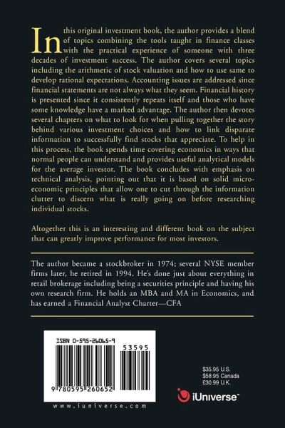 In this original investment book, the author provides a blend of topics combining the tools taught in finance classes with the practical experience of someone with three decades of investment success. The author covers several topics including the arithmetic of stock valuation and how to use same to develop rational expectations. Accounting issues are addressed since financial statements are not always what they seem. Financial history is presented since it consistently repeats itself and those who have some knowledge have a marked advantage. The author then devotes several chapters on what to look for when pulling together the story behind various investment choices and how to link disparate information to successfully find stocks that appreciate. To help in this process, the book spends time covering economics in ways that normal people can understand and provides useful analytical models for the average investor. The book concludes with emphasis on technical analysis, pointing out that it is based on solid micro-economic principles that allow one to cut through the information clutter to discern what is really going on before researching individual stocks.
