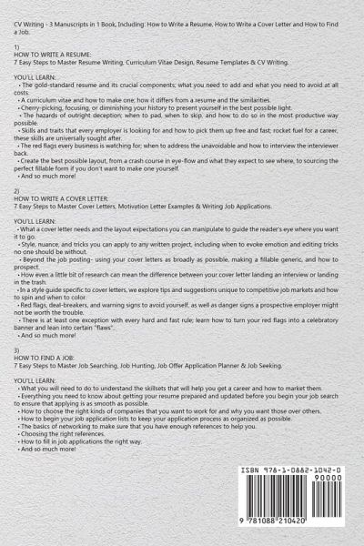 CV Writing - 3 Manuscripts in 1 Book, Including: How to Write a Resume, How to Write a Cover Letter and How to Find a Job. 1) HOW TO WRITE A RESUME: 7 Easy Steps to Master Resume Writing, Curriculum Vitae Design, Resume Templates & CV Writing. YOU'LL LEARN: · The gold-standard resume and its crucial components; what you need to add and what you need to avoid at all costs. · A curriculum vitae and how to make one; how it differs from a resume and the similarities. · Cherry-picking, focusing, or diminishing your history to present yourself in the best possible light. · The hazards of outright deception; when to pad, when to skip, and how to do so in the most productive way possible. · Skills and traits that every employer is looking for and how to pick them up free and fast; rocket fuel for a career, these skills are universally sought after. · The red flags every business is watching for; when to address the unavoidable and how to interview the interviewer back. · Create the best possible layout, from a crash course in eye-flow and what they expect to see where, to sourcing the perfect fillable form if you don't want to make one yourself. · And so much more! 2) HOW TO WRITE A COVER LETTER: 7 Easy Steps to Master Cover Letters, Motivation Letter Examples & Writing Job Applications. YOU'LL LEARN:What a cover letter needs and the layout expectations you can manipulate to guide the reader's eye where you want it to go. Style, nuance, and tricks you can apply to any written project, including when to evoke emotion and editing tricks no one should be without. Beyond the job posting- using your cover letters as broadly as possible, making a fillable generic, and how to prospect. How even a little bit of research can mean the difference between your cover letter landing an interview or landing in the trash. In a style guide specific to cover letters, we explore tips and suggestions unique to competitive job markets and how to spin and when to color. And so much more! 3) HOW TO FIND A JOB: 7 Easy Steps to Master Job Searching, Job Hunting, Job Offer Application Planner & Job Seeking. YOU'LL LEARN: · What you will need to do to understand the skillsets that will help you get a career and how to market them. · How to choose the right kinds of companies that you want to work for and why you want those over others. · How to begin your job application lists to keep your application process as organized as possible. · The basics of networking to make sure that you have enough references to help you. · Choosing the right references. · How to fill in job applications the right way. · And so much more!