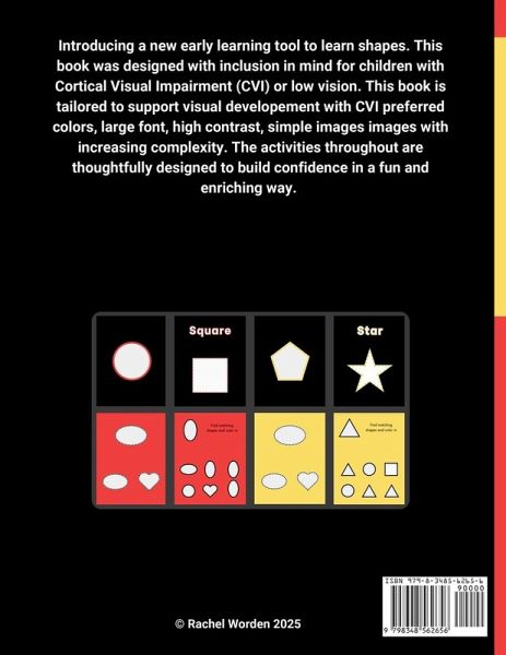 Can individuals with CVI (Cortical Visual Impairment) learn their shapes? Absolutely! While identifying shapes can be more challenging for those with CVI, the right tools can make a big difference. This activity book is specifically designed to support individuals with CVI or low vision, featuring high-contrast, simple images to make the images clearer and easier to see. This 122-page, 8.5 x 11 book is filled with pages that have either a black background with red or yellow lines or a red or yellow background with black lines, paired with simple, bold designs. The image interior remains white, providing a clear space for children to apply color, as shown on the cover. For examples, please refer to the back cover. This unique series is the first of its kind, opening doors for children with low vision or CVI to explore, learn, and express themselves in a fun and creative way. We hope this book enhances their learning experience and sparks their creativity! We also offer additional coloring books in this and other series, featuring your child's preferred color-red, yellow, or multicolor.