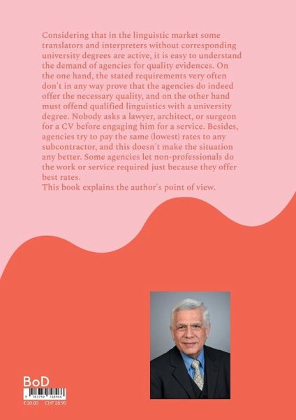 Considering that in the linguistic market some translators and interpreters without corresponding university degrees are active, it is easy to understand the demand of agencies for quality evidences. On the one hand, the stated requirements very often don't in any way prove that the agencies do indeed offer the necessary quality, and on the other hand must offend qualified linguistics with a university degree. Nobody asks a lawyer, architect, or surgeon for a CV before engaging him for a service. Besides, agencies try to pay the same (lowest) rates to any subcontractor, and this doesn't make the situation any better. Some agencies let non-professionals do the work or service required just because they offer best rates. This book explains the author's point of view.
