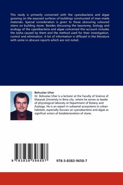 This study is primarily concerned with the cyanobacteria and algae growing on the exposed surfaces of buildings constructed of man-made materials. Special consideration is given to those obscuring coloured stains on building stone. Besides discussing the taxonomy, biology and ecology of the cyanóbacteria and algae concerned this account includes the tasha caused by them and the method used for their investigation, control and elimination. A lot of information is diffused in the literature with some in obscure reports which are not noted.