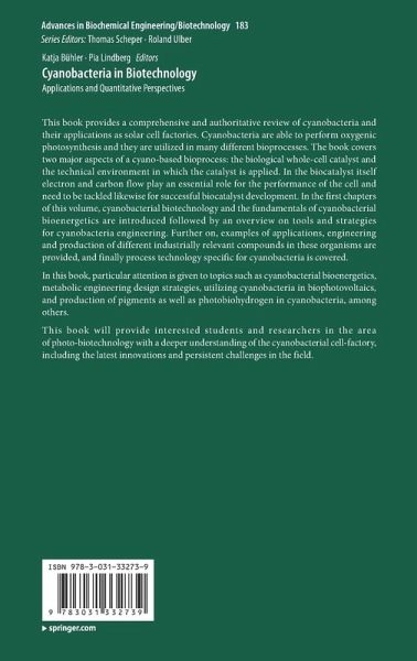 Spotlight on Cyano-photo-biotechnology: Advantages and persisting challenges.- Cyanobacterial bioenergetics in relation to cellular growth and productivity.- The molecular toolset and techniques required to build cyanobacterial cell factories.- Metabolic engineering design strategies for increasing carbon fluxes relevant for biosynthesis in cyanobacteria.- Production of fatty acids and derivatives using cyanobacteria.- Sustainable production of pigments from cyanobacteria.- Photobiohydrogen production and strategies for H2 yield improvements in cyanobacteria.- Utilizing cyanobacteria in biophotovoltaics: an emerging field in bioelectrochemistry.- Process Technologies of Cyanobacteria.