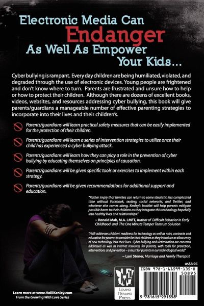 Electronic Media Can Endanger As Well As Empower Your Kids Cyber bullying is rampant. Every day children are being humiliated, violated, and degraded through the use of electronic devices. Young people are frightened and don't know where to turn. Parents are frustrated and unsure how to help or how to protect their children. Although there are dozens of excellent books, videos, websites, and resources addressing cyber bullying, this book will give parents/guardians a manageable number of effective parenting strategies to incorporate into their lives and their children's. Parents/guardians will learn practical safety measures that can be easily implemented for the protection of their children. Parents/guardians will learn a series of intervention strategies to utilize once their child has experienced a cyber bullying attack. Parents/guardians will learn how they can play a role in the prevention of cyber bullying by educating themselves on principles of causation. Parents/guardians will be given specific tools or exercises to implement within each strategy. Parents/guardians will be given recommendations for additional support and education. Therapists' Acclaim for Cyber Bullying No More "Rather imply that families can return to some idealistic less complicated time without Facebook, sexting, social networks, and Twitter, and whatever else comes along, Kenley's booklet will help parents mitigate possible harm to their children as they integrate this technology hopefully into healthy lives and relationships." --Ronald Mah, M.A. LMFT, author of Difficult Behavior in Early Childhood and The One Minute Temper Tantrum Solution "Holli addresses children's readiness for technology as well as rules, contracts and education for parents to consider for their children as they introduce or allow entry of new technology into their lives. Cyber bullying and victimization are concerns addressed as well as internet resources for parents, with tools for protection, interventions and prevention--a must for parents in our technological world." --Lani Stoner, Marriage and Family Therapist Learn more at www.HolliKenley.com From the Growing With Love Series at Loving Healing Press www.LovingHealing.com