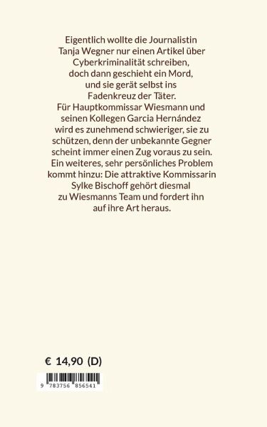 Eigentlich wollte die Journalistin Tanja Wegner nur einen Artikel über Cyberkriminalität schreiben, doch dann geschieht ein Mord, und sie gerät selbst unvermittelt ins Fadenkreuz der Täter.Für Hauptkommissar Wiesmann und seinen Kollegen Garcia Hernández wird es zunehmend schwieriger, sie zu schützen, denn der unbekannte Gegner scheint immer einen Zug voraus zu sein.Ein weiteres, sehr persönliches Problem kommt hinzu: Die attraktive Kommissarin Sylke Bischoff gehört diesmal zu Wiesmanns Team und fordert ihn auf ihre Art heraus.