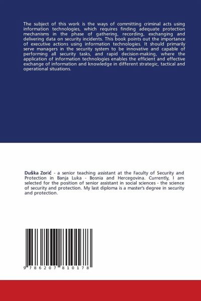 The subject of this work is the ways of committing criminal acts using information technologies, which requires finding adequate protection mechanisms in the phase of gathering, recording, exchanging and delivering data on security incidents. This book points out the importance of executive actions using information technologies. It should primarily serve managers in the security system to be innovative and capable of performing all security tasks, and rapid decision-making, where the application of information technologies enables the efficient and effective exchange of information and knowledge in different strategic, tactical and operational situations.