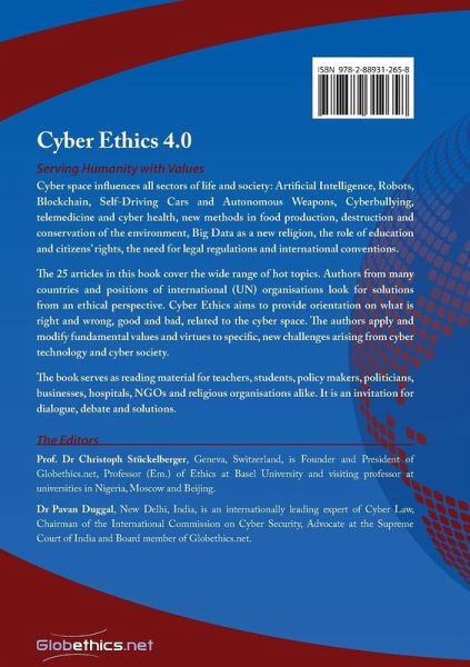 Cyber space influences all sectors of life and society: Artificial Intelligence, Robots, Blockchain, Self-Driving Cars and Autonomous Weapons, Cyberbullying, telemedicine and cyber health, new methods in food production, destruction and conservation of the environment, Big Data as a new religion, the role of education and citizens' rights, the need for legal regulations and international conventions. The 25 articles in this book cover the wide range of hot topics. Authors from many countries and positions of international (UN) organisations look for solutions from an ethical perspective. Cyber Ethics aims to provide orientation on what is right and wrong, good and bad, related to the cyber space. The authors apply and modify fundamental values and virtues to specific, new challenges arising from cyber technology and cyber society. The book serves as reading material for teachers, students, policy makers, politicians, businesses, hospitals, NGOs and religious organisations alike. It is an invitation for dialogue, debate and solutions.