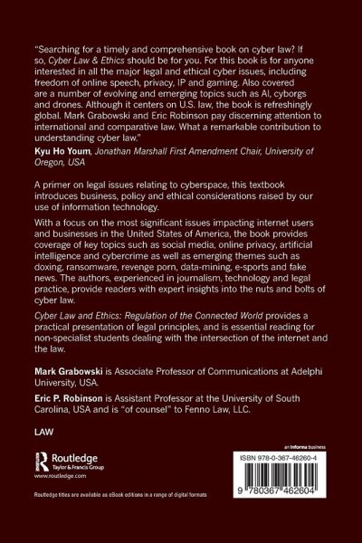 "Searching for a timely and comprehensive book on cyber law? If so, Cyber Law & Ethics should be for you. For this book is for anyone interested in all the major legal and ethical cyber issues, including freedom of online speech, privacy, IP and gaming. Also covered are a number of evolving and emerging topics such as AI, cyborgs and drones. Although it centers on U.S. law, the book is refreshingly global. Mark Grabowski and Eric Robinson pay discerning attention to international and comparative law. What a remarkable contribution to understanding cyber law."