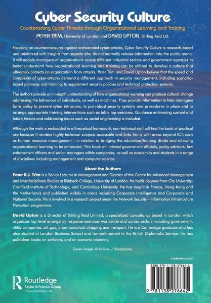 Focusing on countermeasures against orchestrated cyber-attacks, Cyber Security Culture is research-based and reinforced with insights from experts who do not normally release information into the public arena. It will enable managers of organizations across different industrial sectors and government agencies to better understand how organizational learning and training can be utilized to develop a culture that ultimately protects an organization from attacks. Peter Trim and David Upton believe that the speed and complexity of cyber-attacks demand a different approach to security management, including scenario-based planning and training, to supplement security policies and technical protection systems. The authors provide in-depth understanding of how organizational learning can produce cultural change addressing the behaviour of individuals, as well as machines. They provide information to help managers form policy to prevent cyber intrusions, to put robust security systems and procedures in place and to arrange appropriate training interventions such as table top exercises. Guidance embracing current and future threats and addressing issues such as social engineering is included. Although the work is embedded in a theoretical framework, non-technical staff will find the book of practical use because it renders highly technical subjects accessible and links firmly with areas beyond ICT, such as human resource management - in relation to bridging the education/training divide and allowing organizational learning to be embraced. This book will interest Government officials, policy advisors, law enforcement officers and senior managers within companies, as well as academics and students in a range of disciplines including management and computer science.