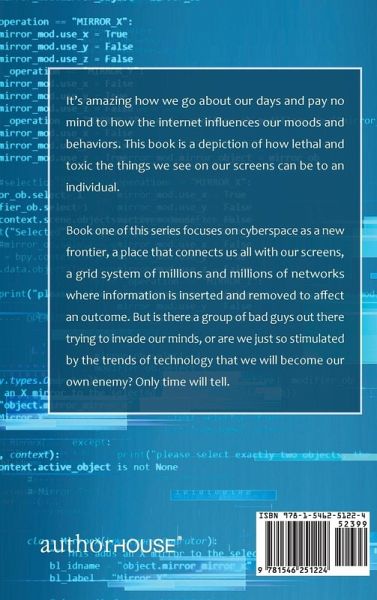 Its amazing how we go about our days and pay no mind to how the internet influences our moods and behaviors. This book is a depiction of how lethal and toxic the things we see on our screens can be to an individual. Book 1 of this series focuses on cyberspace as a new frontier, a place that connects us all with our screens, a grid system of millions and millions of networks where information is inserted and removed to affect an outcome. But is there a group of bad guys out there trying to invade our minds, or are we just so stimulated by the trends of technology that we will become our own enemy? Only time will tell.