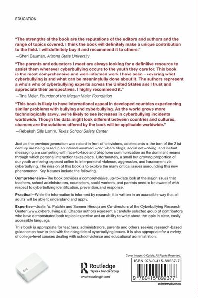 Preface, Justin W. Patchin and Sameer Hinduja 1. A 'Living Internet': Some Context for the Cyberbullying Discussion, Anne Collier 2. Cyberbullying: An Update and Synthesis of the Research, Justin W. Patchin and Sameer Hinduja 3. Cyberbullying and the Law, Nancy Willard 4. Youth Views on Cyberbullying, Patricia Agatston, Robin Kowalski, and Susan Limber 5. Cyberbullying: How School Counselors Can Help, Russell Sabella 6. Empowering Bystanders, Stan Davis and Charisse Nixon 7. You Mean We Gotta Teach That, Too? Mike Donlin 8. A "Toolbox" of Cyberbullying Prevention Initiatives and Activities, Jenny Walker 9. Responding to Cyberbullying: Advice for Educators and Parents, Elizabeth K. Englander 10. School Law Enforcement and Cyberbullying, Sameer Hinduja and Justin W. Patchin Appendix A: Select Cyberbullying Curricula, Lesson Plans, and Materials Appendix B: List of States with Bullying and Cyberbullying Laws