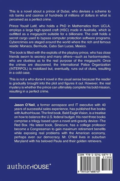 This is a novel about a prince of Dubai, who devises a scheme to rob banks and casinos of hundreds of millions of dollars in what is perceived as a perfect crime. Prince Yousif Latif, who holds a PhD in Mathematics from UCLA, employs a large high-speed craft (HSC) made in Australia, which is outfitted as a megayacht suitable for a billionaire. The craft holds a secret cargo used to bypass computer protection software programs. Cybercrimes are staged around the world where the rich and famous reside: Monaco, Bermuda, Cabo San Lucas, Mexico. The book is filled with the exploits of the playboy prince, who has close friends sworn to secrecy and many others—such as harbormasters, who are clueless as to the real purpose of the megayacht. Once the crimes are discovered, the International Police Organization (INTERPOL) is mobilized but, eventually, runs out of clues, resulting in a cold case. This is not a who-done-it novel in the usual sense because the reader is gradually brought into the plot and figures it out. However, the real mystery is whether the prince can ultimately complete his bold mission, resulting in a perfect crime.